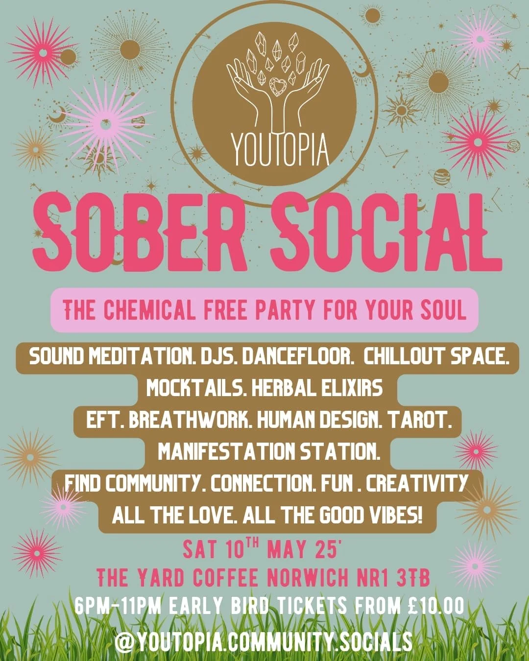 Welcome to the Youtopia Sober Social at our new venue The Yard Coffee! In the heart of the city centre of Norwich, we are so excited to be creating this from a gorgeous venue. Youtopia Community is an artistic, environmentally conscious, wellness space where you can find connection, fun and meaning. We make fun, chemical free, accessible events for adults including sober socials, play retreats, silent discos, super clubs, days out and more. We are here to nourish your soul!